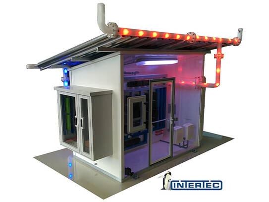 INTERTEC's hybrid shelter cooling concept is being demonstrated using a model with LED lighting effects that illustrate the natural circulation principle of passive cooling systems. INTERTEC's demonstration model also illustrates a radical new form of shelter configuration that can dramatically reduce plant building sizes, and greatly simplify construction and installation. Known as the PERI SHELTER, it makes all the system components that are required for normal operation accessible via the building's exterior. Panel-mounting enclosures on the exterior provide access to electrical connection and I/O termination points, and cooling systems. Touchscreen HMI panels can also be fitted to external walls, allowing operators on the ground to monitor a control element such as a PLC or make adjustments to control programs locally via an inspection door.