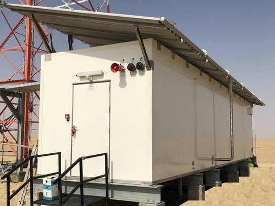 Cooling efficiency is aided by the shelter's construction, which uses composite wall panels with GRP sheets 'sandwiching' an embedded 85 mm layer of polyurethane foam insulation. In conjunction with a sunshade, this delivers very stable interior environmental conditions compared with conventional metal-based shelters. INTERTEC's manufacturing process allows it to fabricate composite GRP panels with many different material layers. In this application, the outer GRP layers provide exceptional resistance to corrosion - as GRP does not rust or degrade in any meaningful way. A further gel-coat layer on the exterior surface provides protection against the climate's very high levels of ultraviolet light, and abrasion from dust or sand. The externally-mounted water coolers additionally feature a centrifugal sediment separator that removes dust and sand, and flaps that close when the cooler is not operational.
