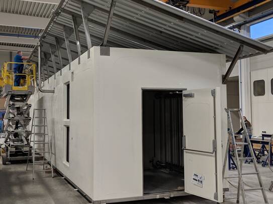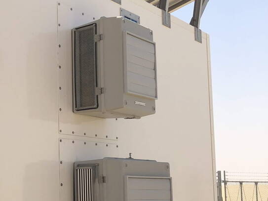 The water coolers are a new variant of INTERTEC's novel HYBRICOOL range that operate directly from a DC power supply - making them an efficient solution for solar-powered installations. These cooling units are specially designed to supplement passive coolers operating in process plants, with a heat exchanger element that can be installed inside the water storage tank of a passive cooling system to decrease temperature. This interior element is isolated from the rest of the externally-mounted refrigeration system, making it both an efficient and economic solution for explosion proof applications such as the battery compartment of this shelter.